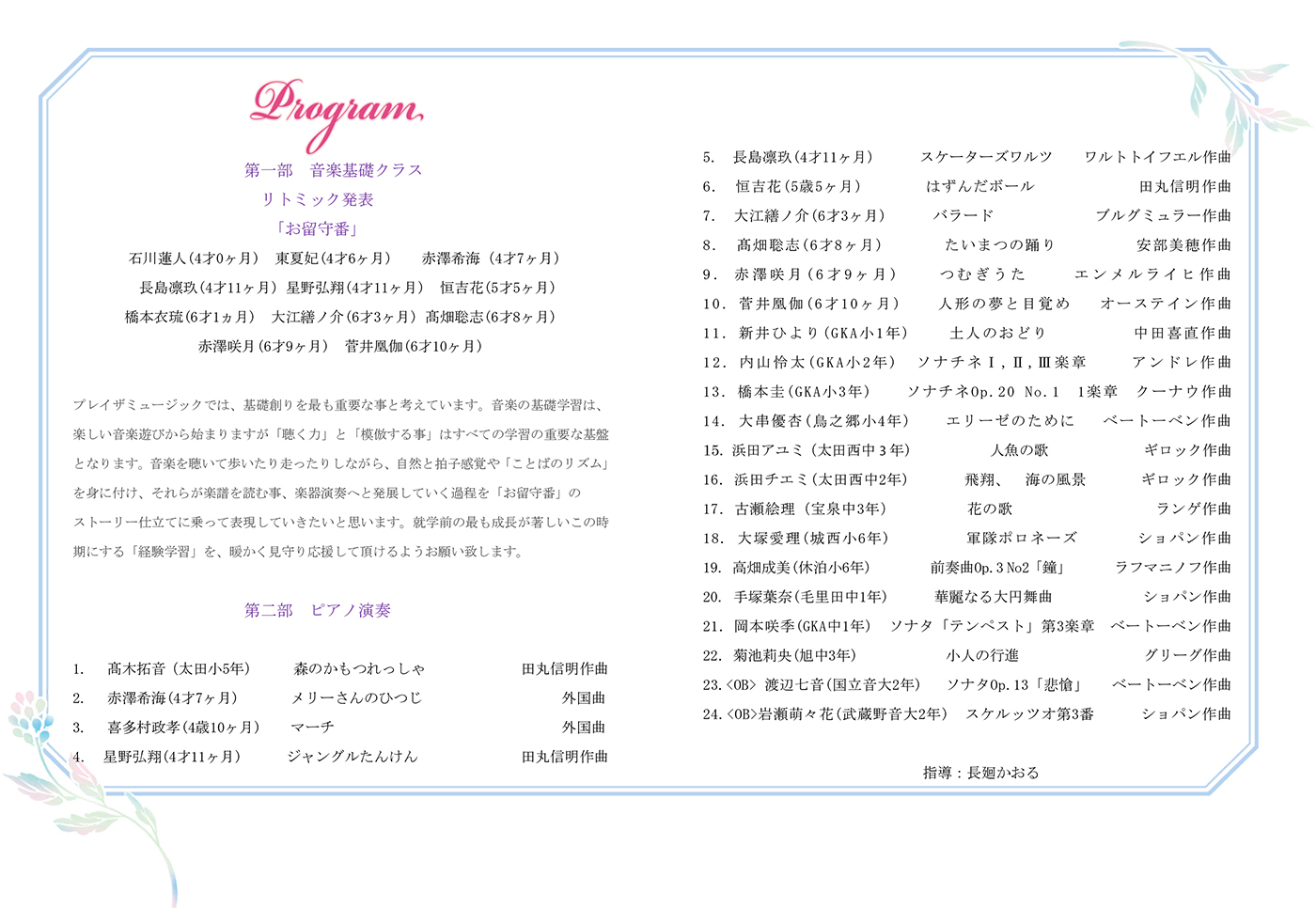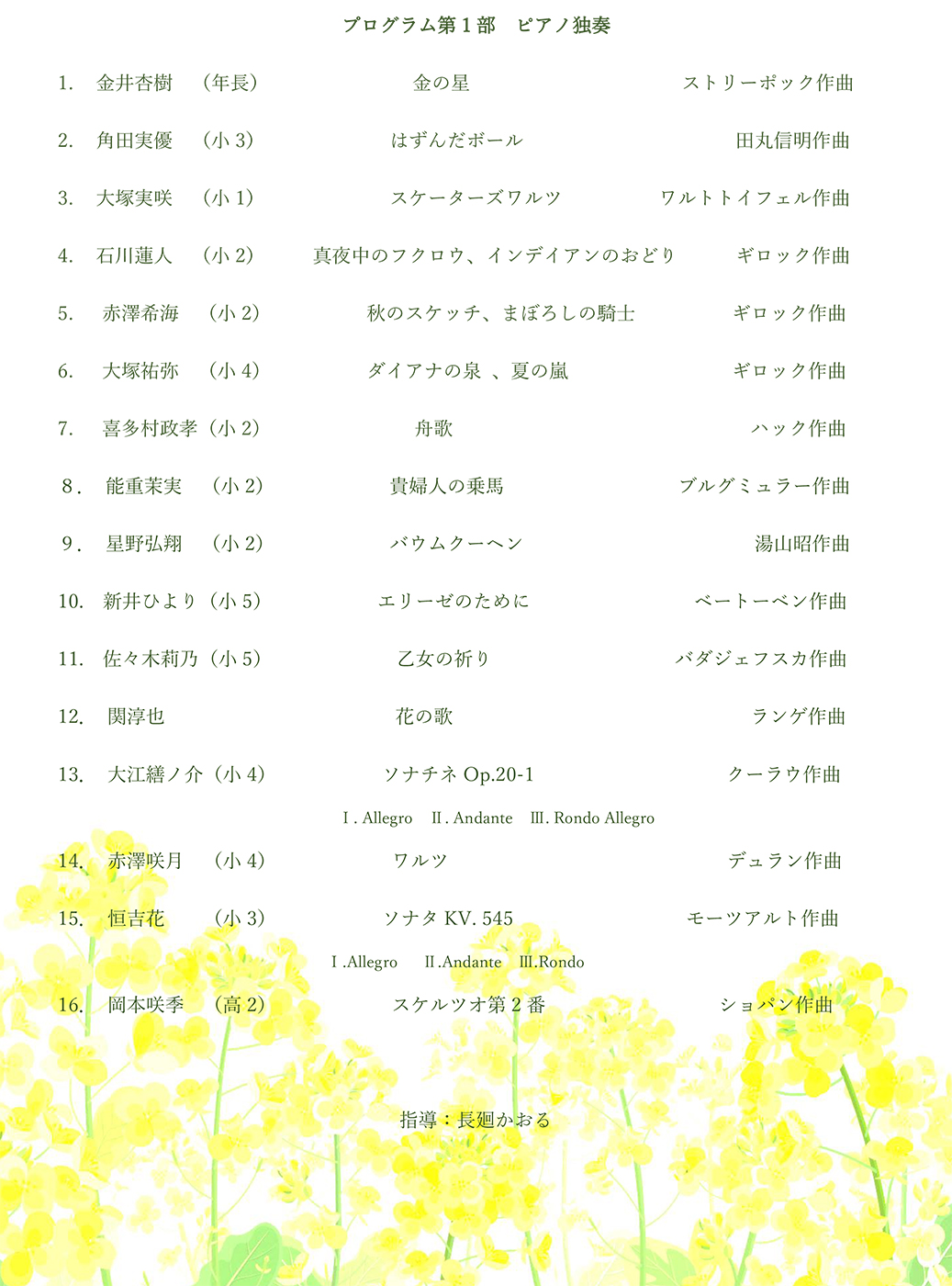 | ♦プログラム: | 第1部 リトミック発表 第2部 ピアノ演奏 ショパン、ベートーベン、バッハ、 ドビッシー、シベリウス 他 |