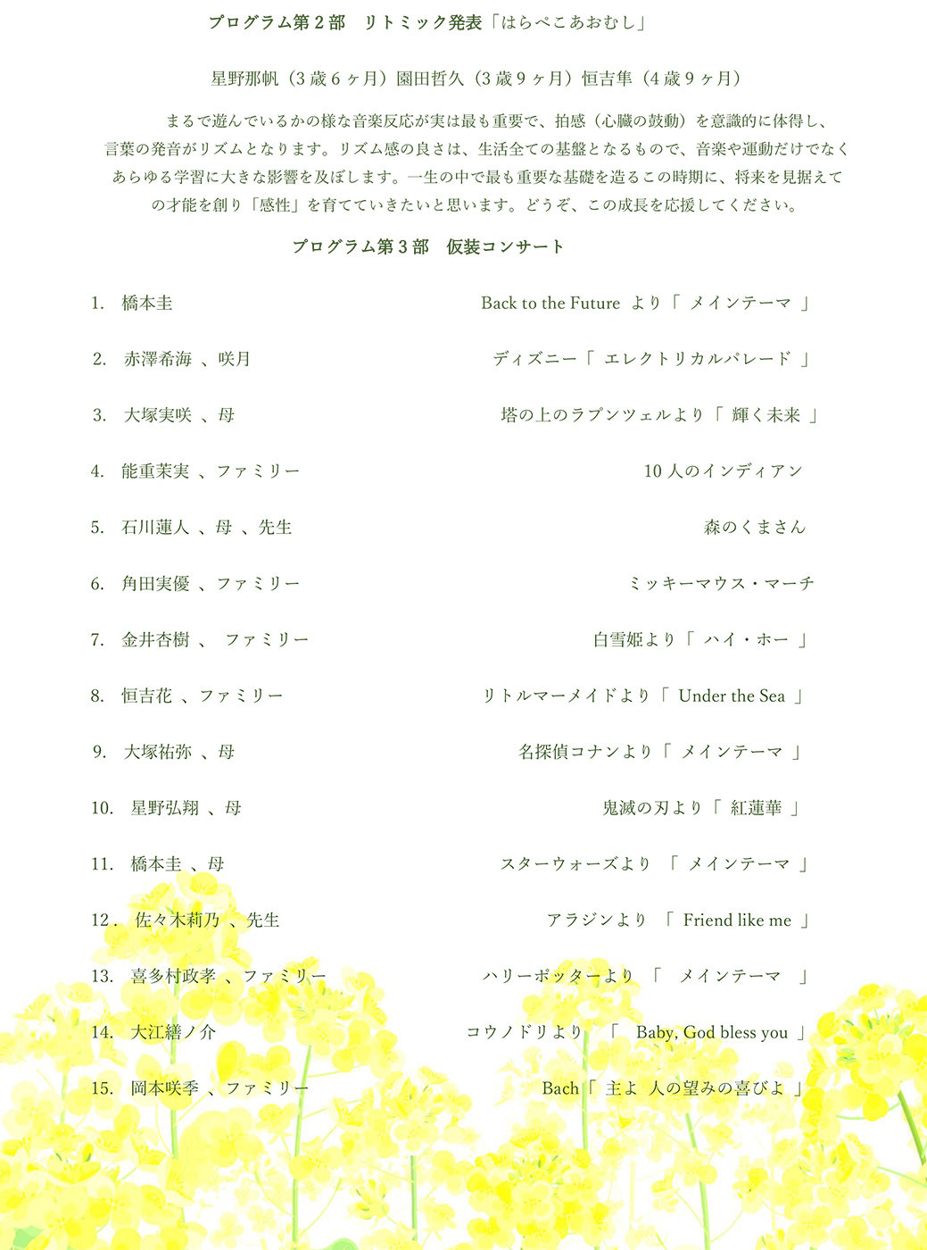 第一部では初めての音楽体験を親子一緒に楽しむ姿を、第二部ではその後の成長過程を有名なピアノ曲を通して見ていただけるようにとみんな一生懸命練習をし、本番では見事に練習の成果を発表することができました。