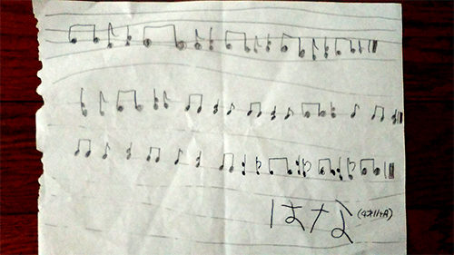 恒吉花ちゃん(4歳)リトミックからピアノレッスンになって3ヵ月、両手で「チューリップ」「メリーさんの羊」が弾けるようになりました。 はじめての作曲!? 楽譜らしいモノを書いてくれました。スゴいね(*^▽^*)♪ (※画像クリックで拡大)